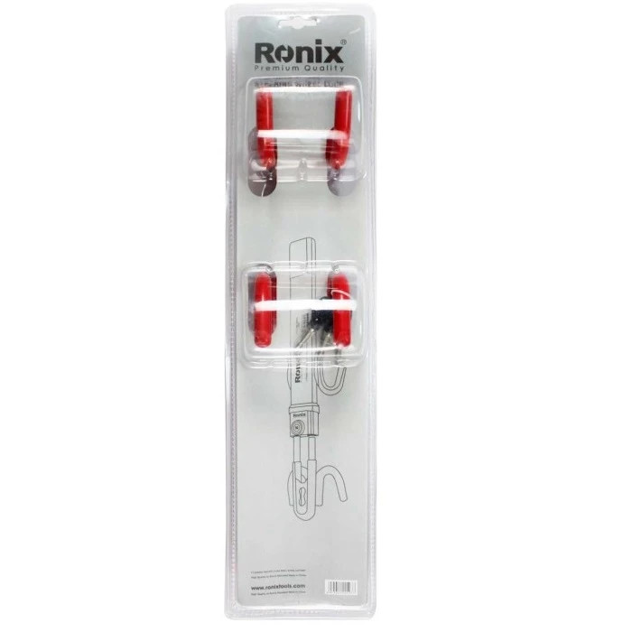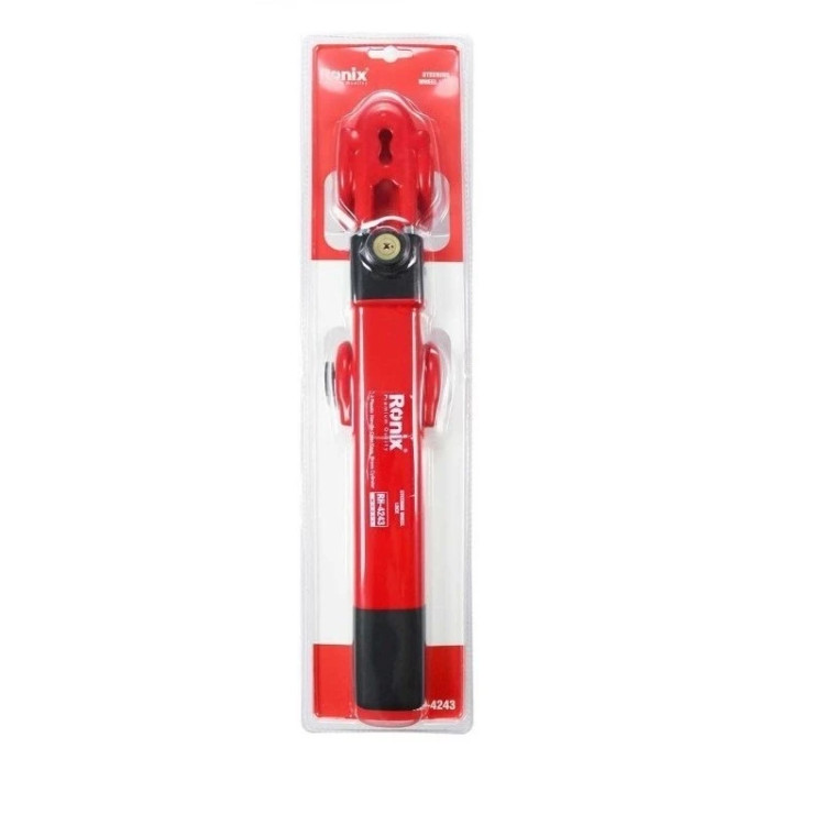قفل فرمان دوبل رونیکس مدل RH-4243 ساخت کشور چین بدنه ای تولید شده از فولاد مقاوم و مستحکم در برابر ضربه و برش دارای قفل و مغزی از جنس برنج با مقاومت بالا در برابر انواع سوراخ کاری مجهز به روکش PVC در قسمت U شکل جهت افزایش حفاظت از فرمان توانایی تنظیم ساده و آسان جهت منطبق شدن با هر قطر فرمان پوشش لاستیکی نرم در ابتدا و انتها جهت محافظت قطعات داخل خودرو توانایی قفل همزمان فرمان و پدال جهت افزایش امنیت و ایمنی توانایی تنظیم حداقل و حداکثر طول قفل از 140 تا 230 میلی متر بدنه ای خوش فرم و ارگونومیک به همراه 3 عدد کلید برنجی کامپیوتری